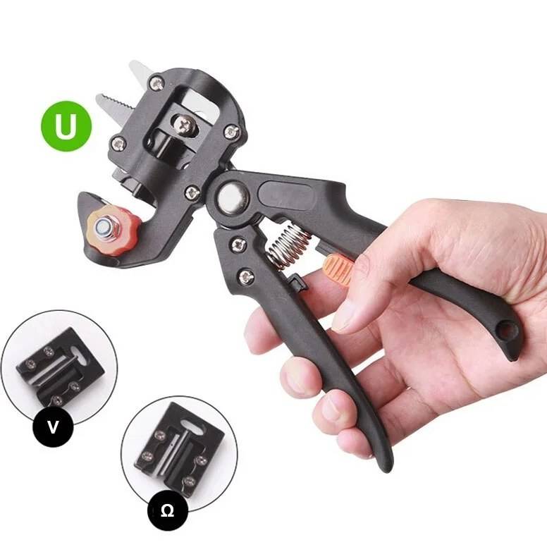 این قیچی مجهز به تیغههای فولادی ضدزنگ است که برشهایی به شکل جناغی، امگا و یو (U-cut, V-cut, Ω-cut) ایجاد میکند. این برشها باعث میشوند "کامیوم" (لایه رشد) شاخه و پایه کاملاً در هم قفل شده و بیشترین تماس را داشته باشند که عامل اصلی موفقیت پیوند است.