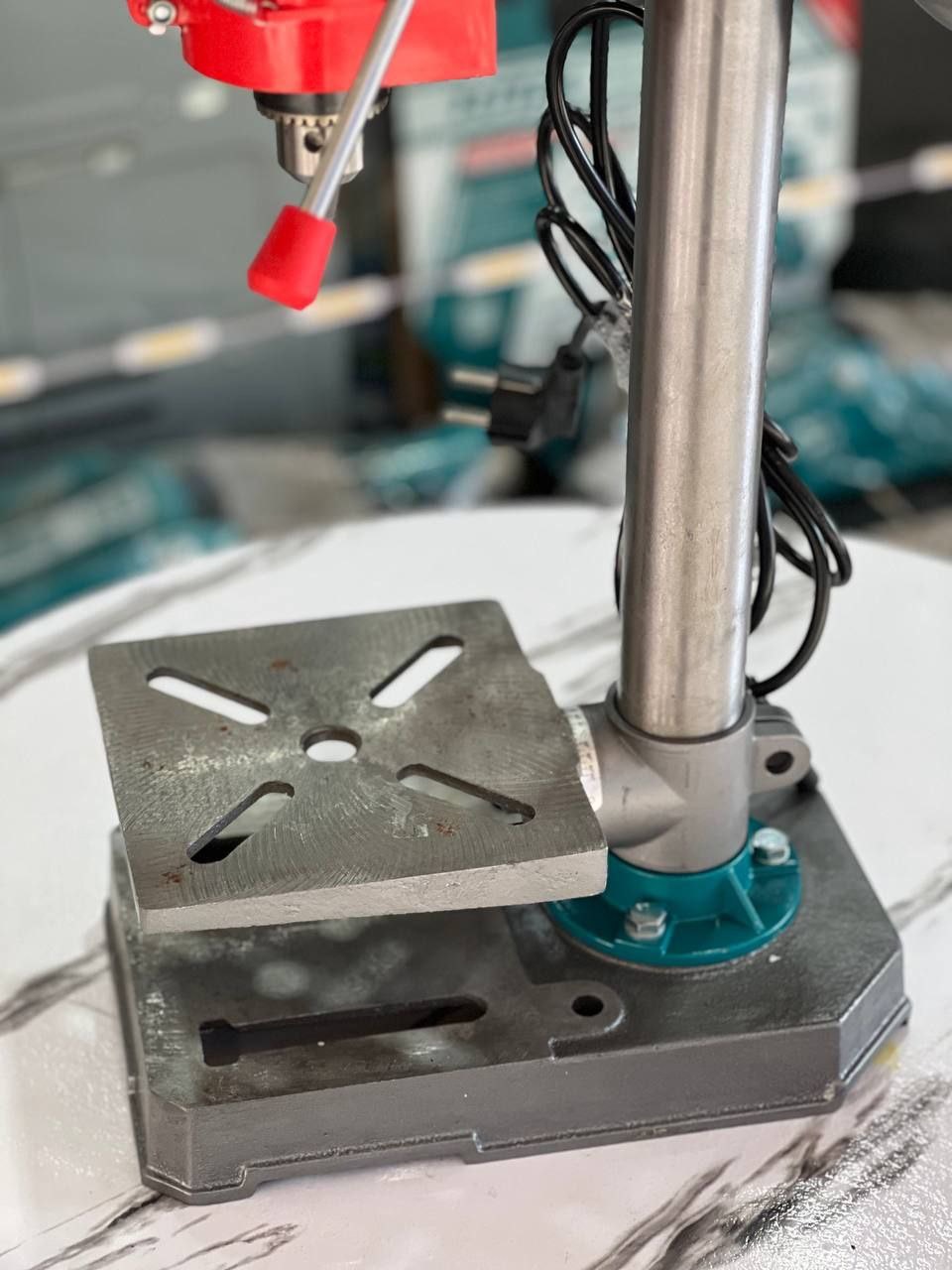 - **میز کار قابل تنظیم:** میز چدنی دستگاه قابلیت تغییر ارتفاع و همچنین زاویه گرفتن تا ۴۵ درجه به طرفین را دارد که امکان سوراخکاریهای زاویهدار را فراهم میکند.